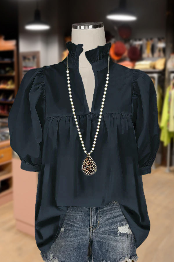 Casual Ruffle High Neck Puff Sleeve Top