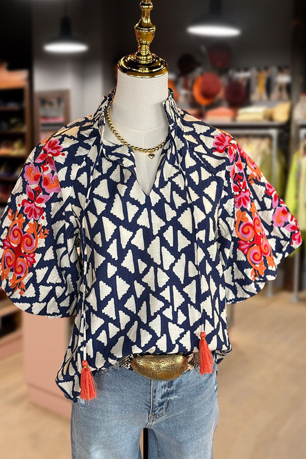 Geo Print Embroidered Puff Sleev Top